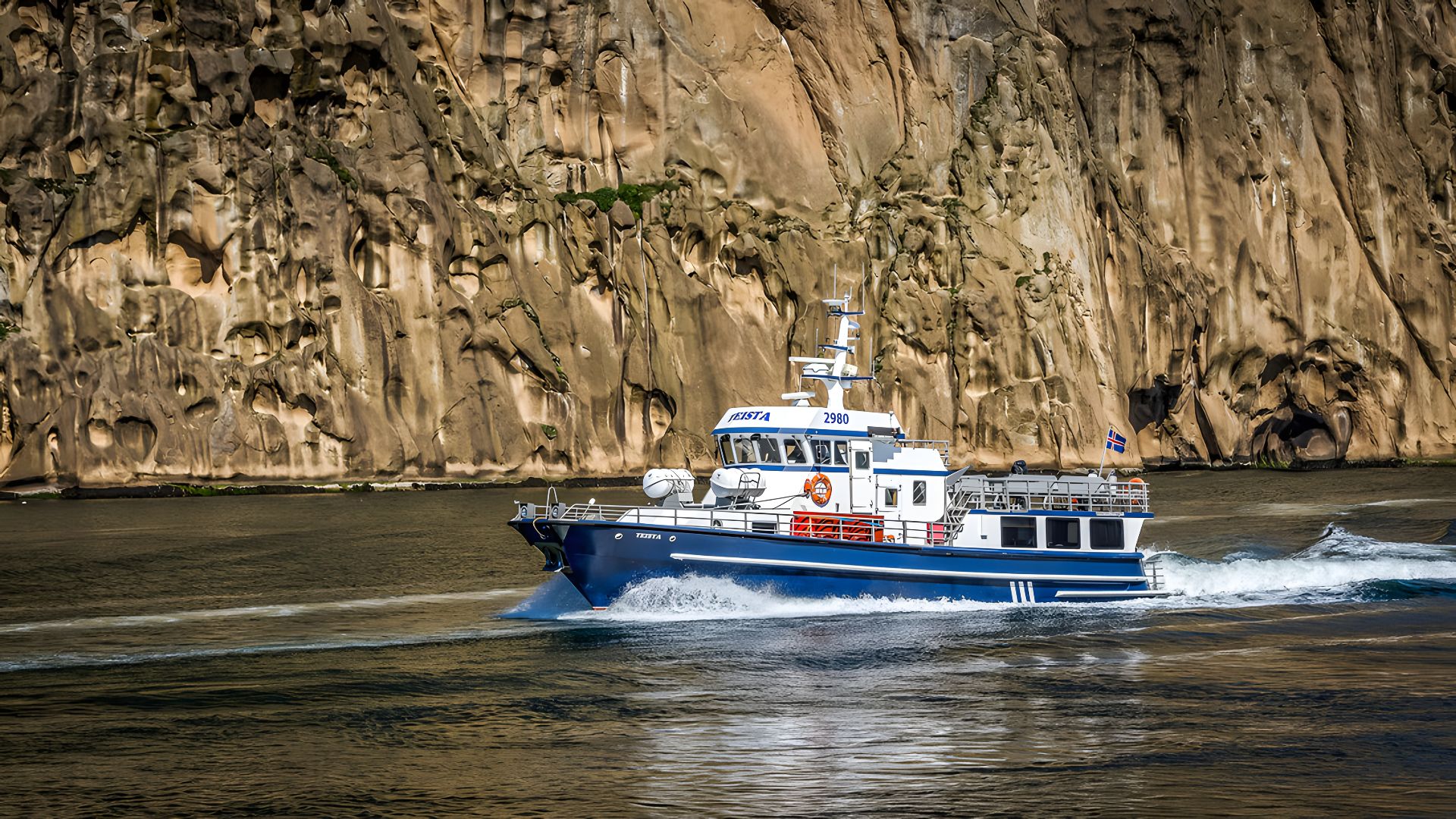 Spot seabirds such as puffins, fulmars, kittiwakes, and gannets, and often seals or whales in high summer. Visit two sea caves—Fjósið, inside the windy Höfði cape, and Klettshellir, famous for its incredible acoustics. The Teista boat holds up to 80 people, but tours take a maximum of 50, with both indoor and outdoor seating.